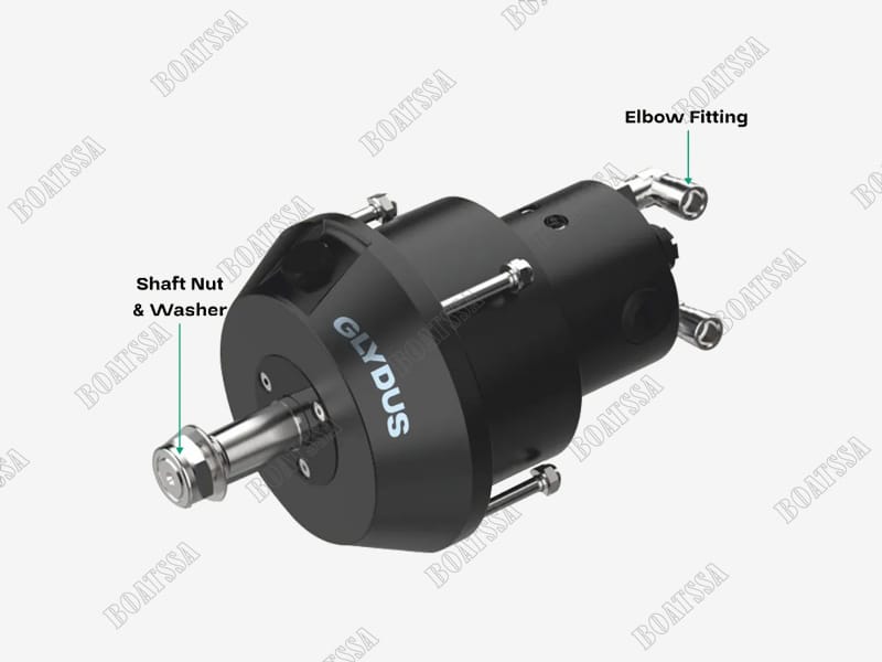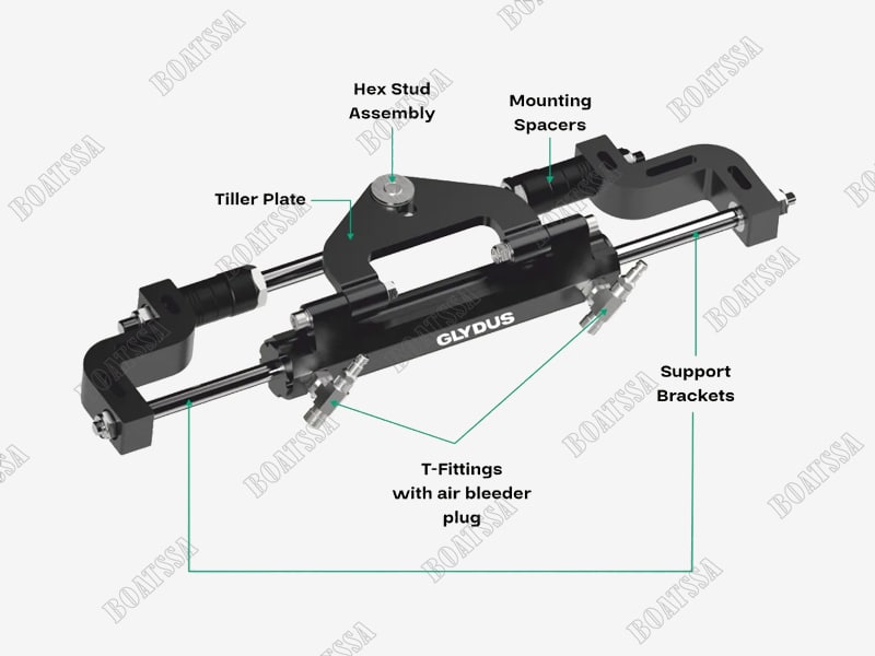 Hydraulic Balanced Cylinder: It provides linear movement to the engine, steering the boat to starboard or port.