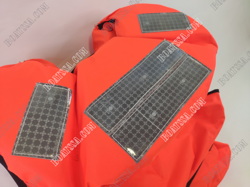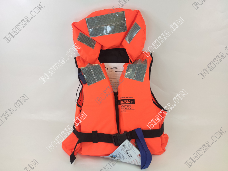 The life jacket features a large flotation collar to support the wearer’s head, keeping it out of water. It also has a crotch strap to keep the life vest secure when in the water. The life vest covers the waist and back and includes a lifting loop for rescue, one webbing fastener and a plastic zip. An end rope with plastic button is fixed on the lifejacket for adjustable wearing. Other features include a Lalizas 70010 whistle and SOLAS retroreflective tapes 70180.